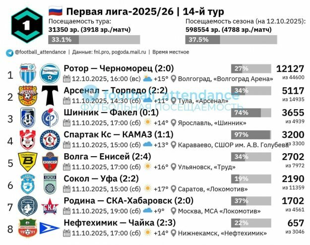 🏟 Больше всего зрителей в туре было в Волгограде (12127), однако для домашних матчей «Ротора» это антирекордная посещаемость в текущем сезоне, на 33% ниже среднего значения клуба в сезоне (17978).