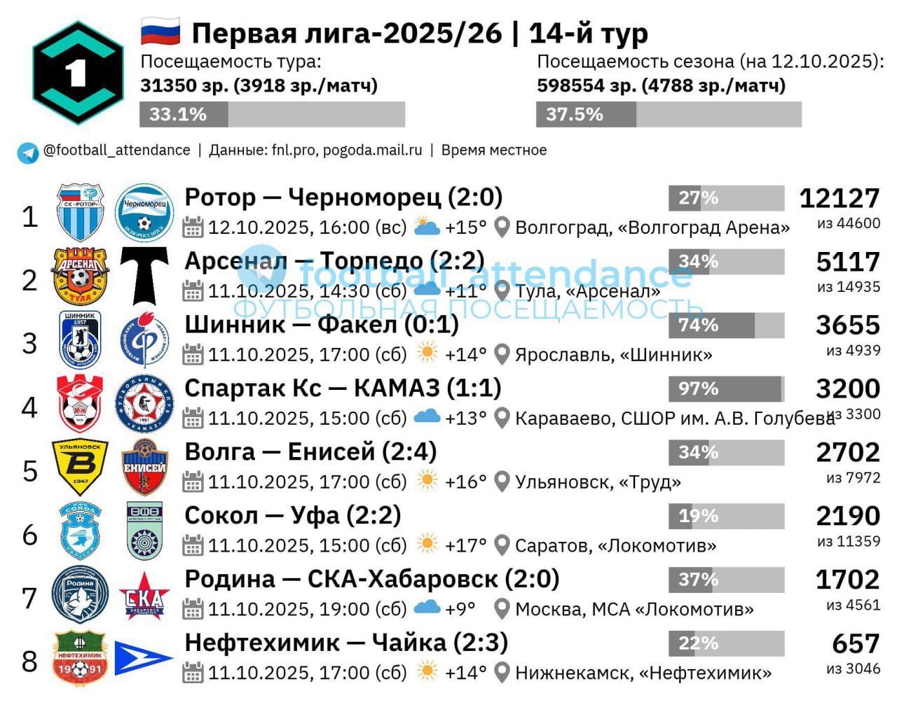 🐝 Посещаемость тура в целом (и, скорее всего, в среднем) будет выше после проведения матча «Урал» — «Челябинск», который был перенесён из-за вызова в сборные футболистов команды из Екатеринбурга.